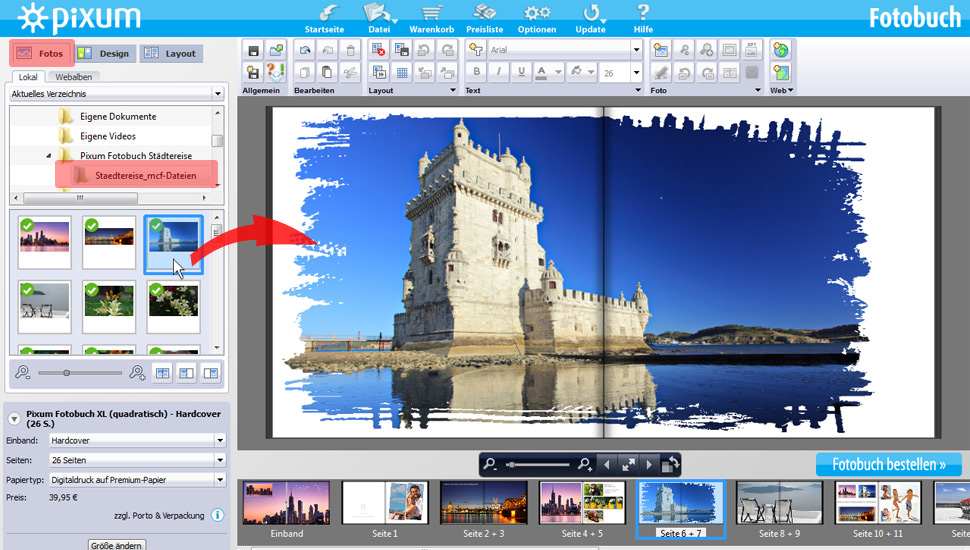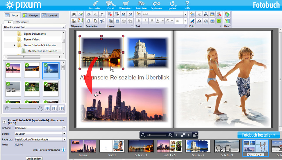 Fotos tauschen Sie aus, indem Sie ein neues Bild aus Ihrem Fotoordner an die gewünschte Stelle im Pixum Fotobuch ziehen.