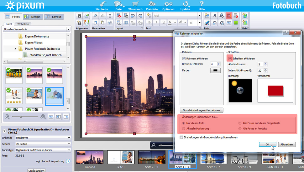 Tipp: Einheitliche Rahmen und Schatten wirken professionell. Am besten übernehmen Sie deshalb die Einstellungen für die gesamte Doppelseite oder für das ganze Pixum Fotobuch.
