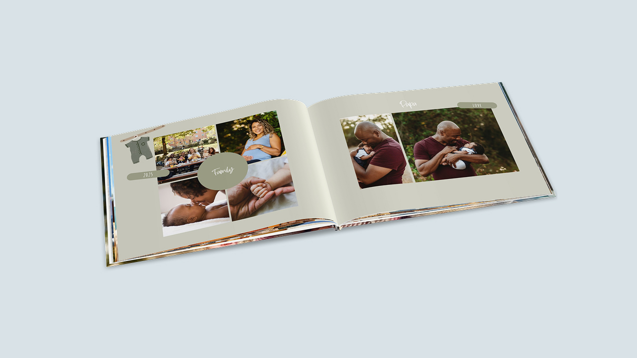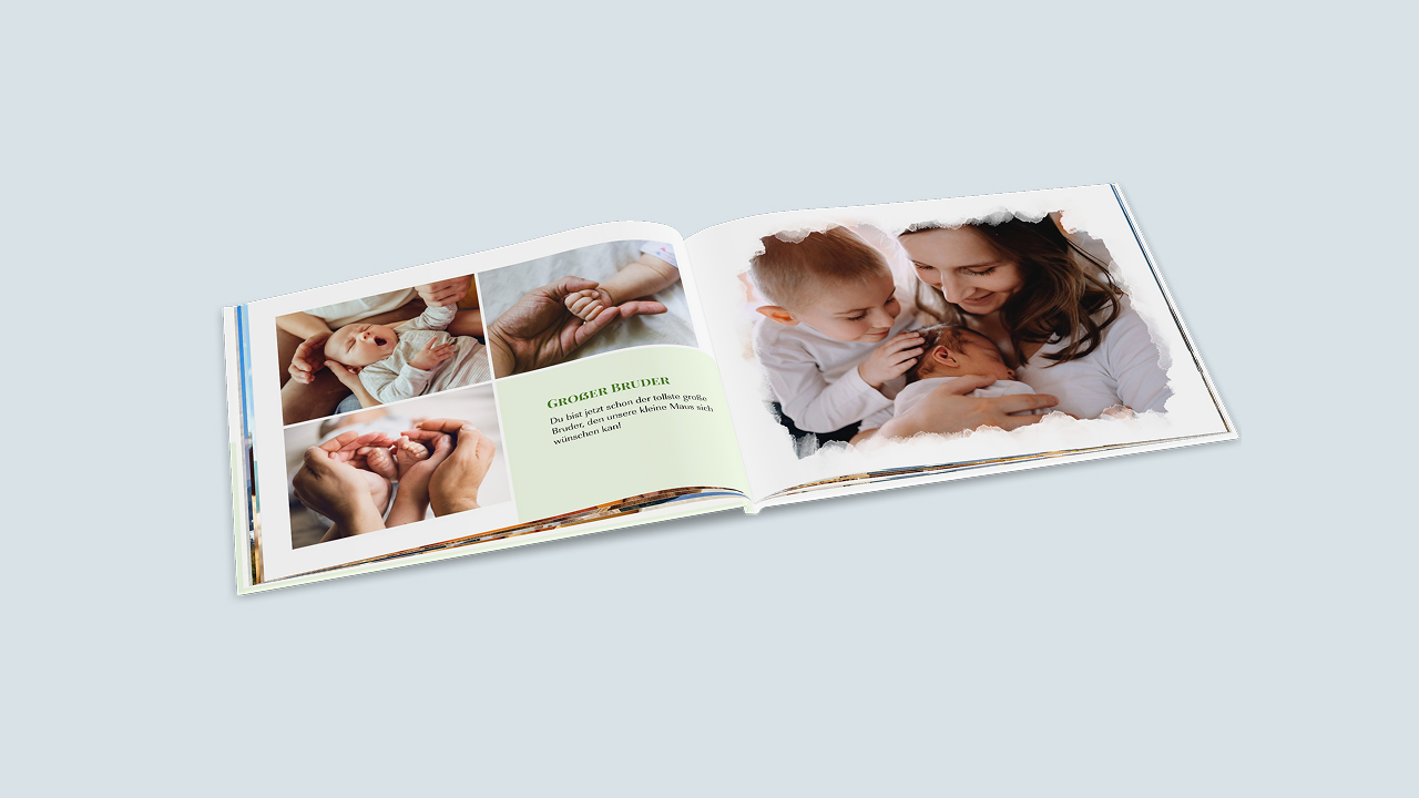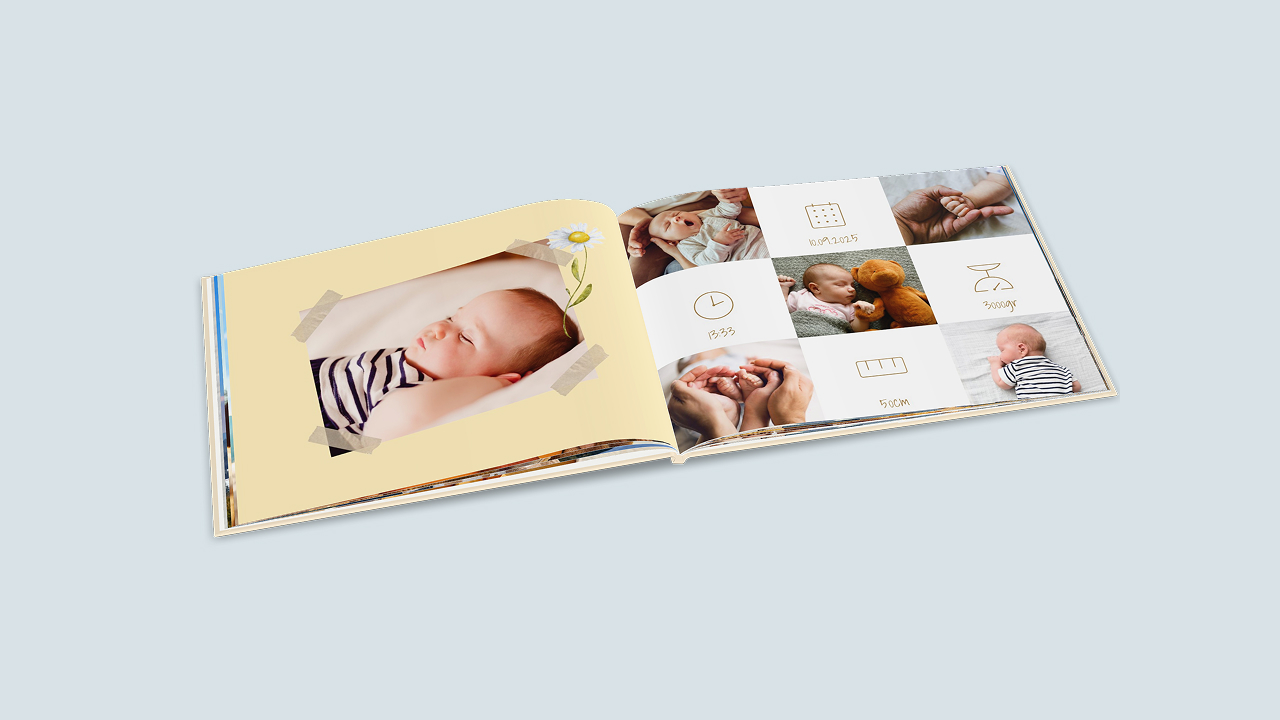 Tipp: Nutze die freien Textflächen, um ein Fotobuch vom ersten Jahr zu gestalten. Strukturiere dein Babyalbum nach Monaten, halte Gewicht und Größe fest oder schreibe Erinnerungstexte zu den verschiedenen Meilensteinen.