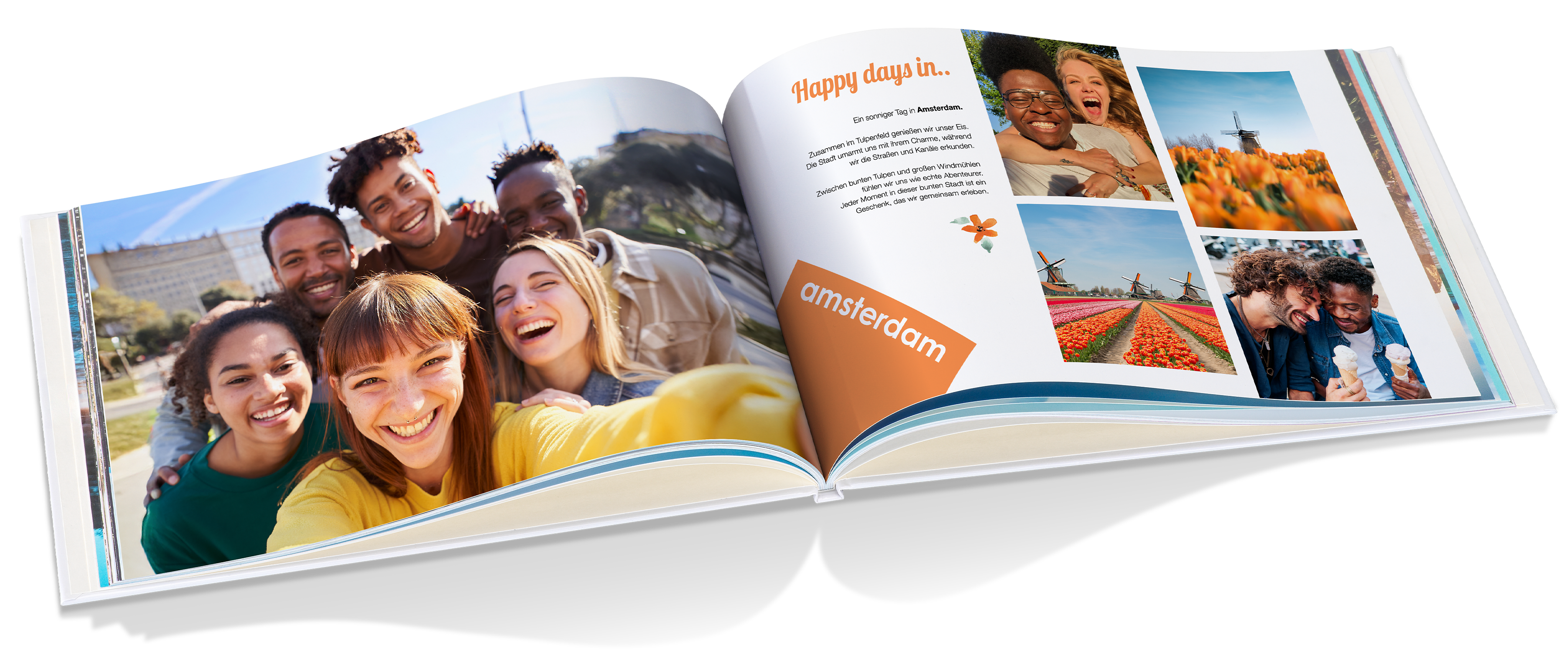 Nutze die große Auswahl an Layouts und vorgestalteten Buchvorlagen, in die du einfach deine Fotos einfügst - selbstverständlich kannst du alle Seiten beliebig weiter bearbeiten.
